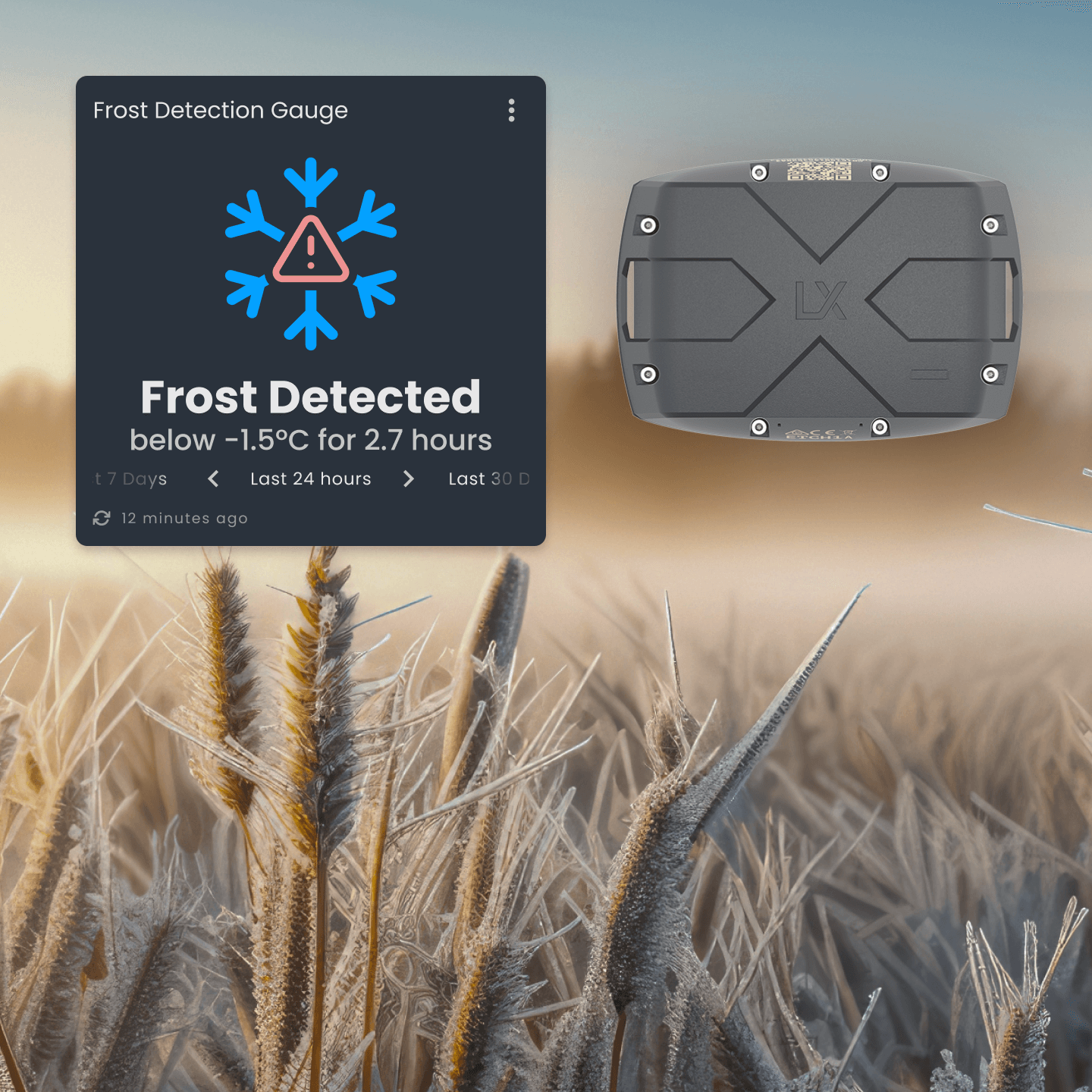 Monitor your crop and be alerted of frost events and their severity (duration and temperature) with Australia's most cost-effective and accurate Frost Detection Kit! INCYT's frost detection solution accurately identifies frost-affected areas and assesses the extent of the damage, providing a cost-effective and standalone solution for precise frost monitoring anywhere on your farm.